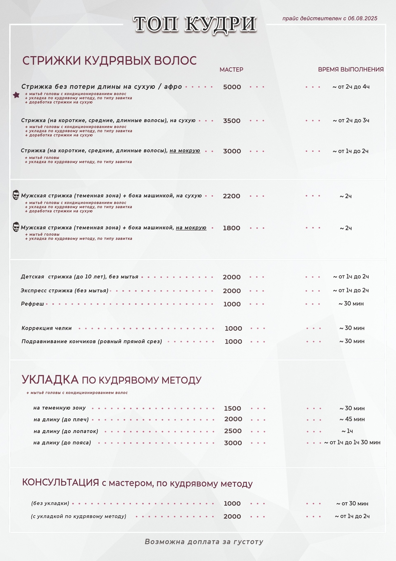 - Кудрявые волосы стригутся на сухую, чтобы сохранить длину и форму, так как не бывает в природе идентичных завитков, и к каждому из них нужен индивидуальный подход - Также, кудри нуждаются в глубоком увлажнении, мастер на процедуре глубоко увлажняет волосы до состояния «водорослей» - Помимо стрижки, одно из главных правил- укладка. Бонусом: мы укладываем ваши кудри по кудрявому методу. Показываем и рассказываем подробно как это сделать дома. - К концу процедуры мы подбираем Вам средства для очищения, увлажнения, фиксации кудряшек, которые Вы можете приобрести у нас по очень выгодной цене.