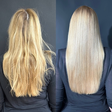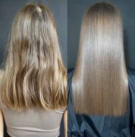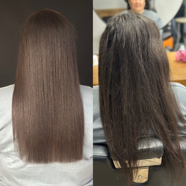 Кератин и питательные компоненты заполняют повреждения, делая волосы визуально более здоровыми.